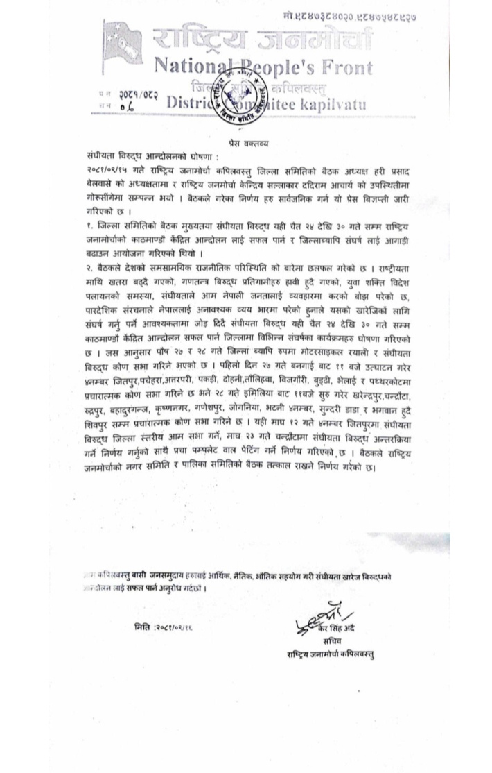 सङ्घीयता खारेजीका लागि काठमाडौँकेन्द्रित आन्दोलनको तयारीस्वरूप राष्ट्रिय जनमोर्चा कपिलवस्तुले कार्यक्रम घोषणा गरेको छ ।
