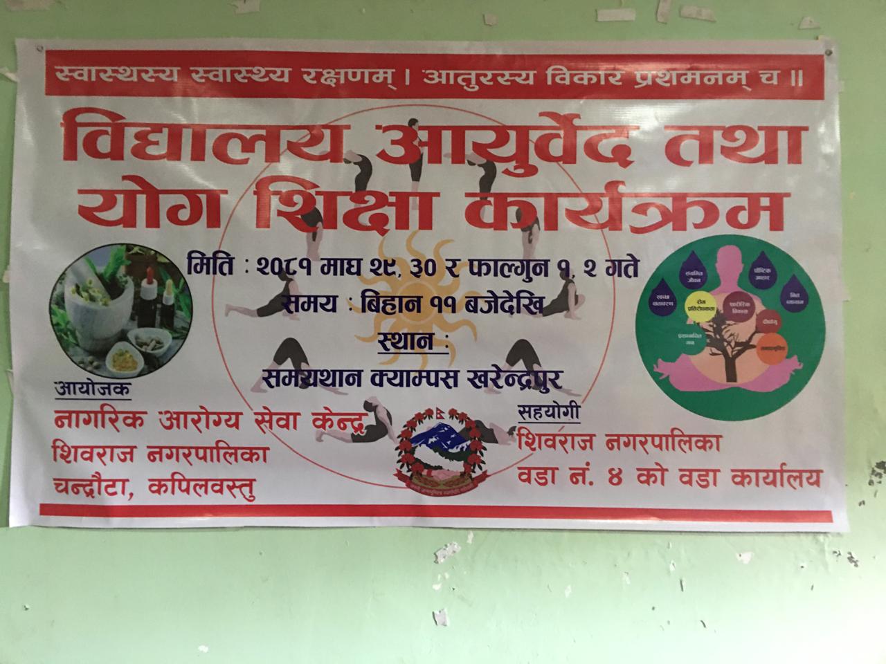कपिलवस्तु शिवराज नगरपालिका वडा नं ४ खरेन्द्रपुरस्थित समयथान माध्यमिक विद्यालयमा आयुर्वेद तथा योग शिक्षा कार्यक्रम’ आजबाट भएको छ ।